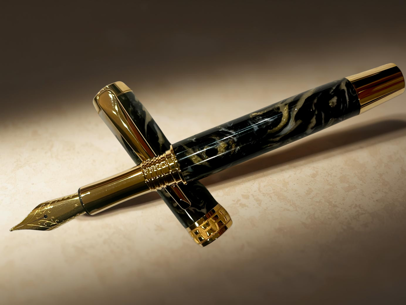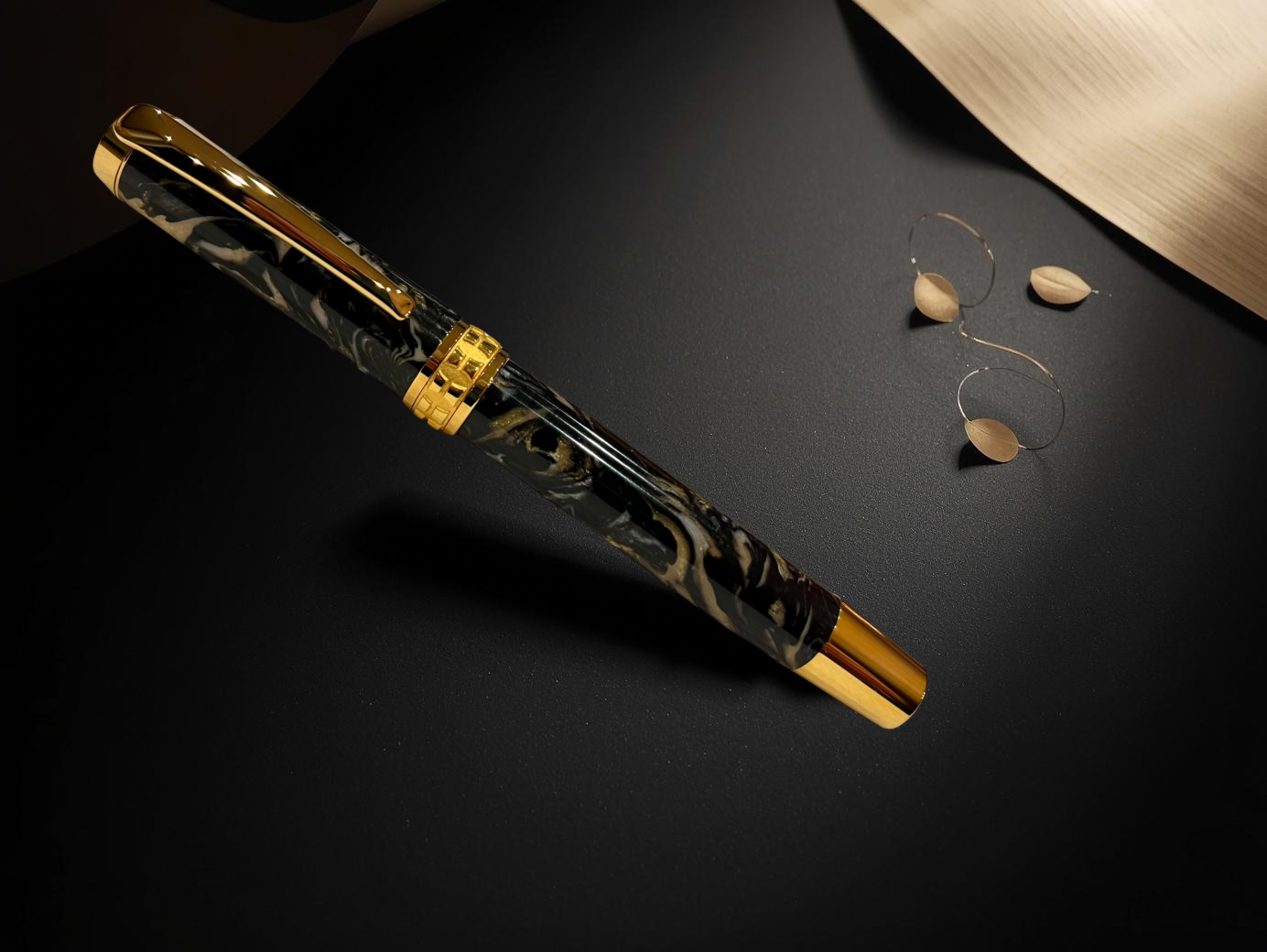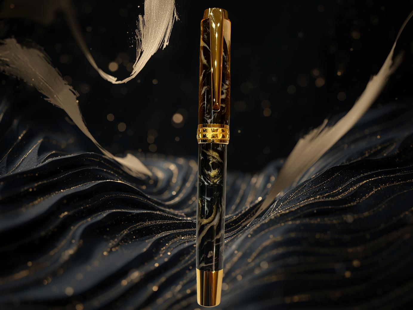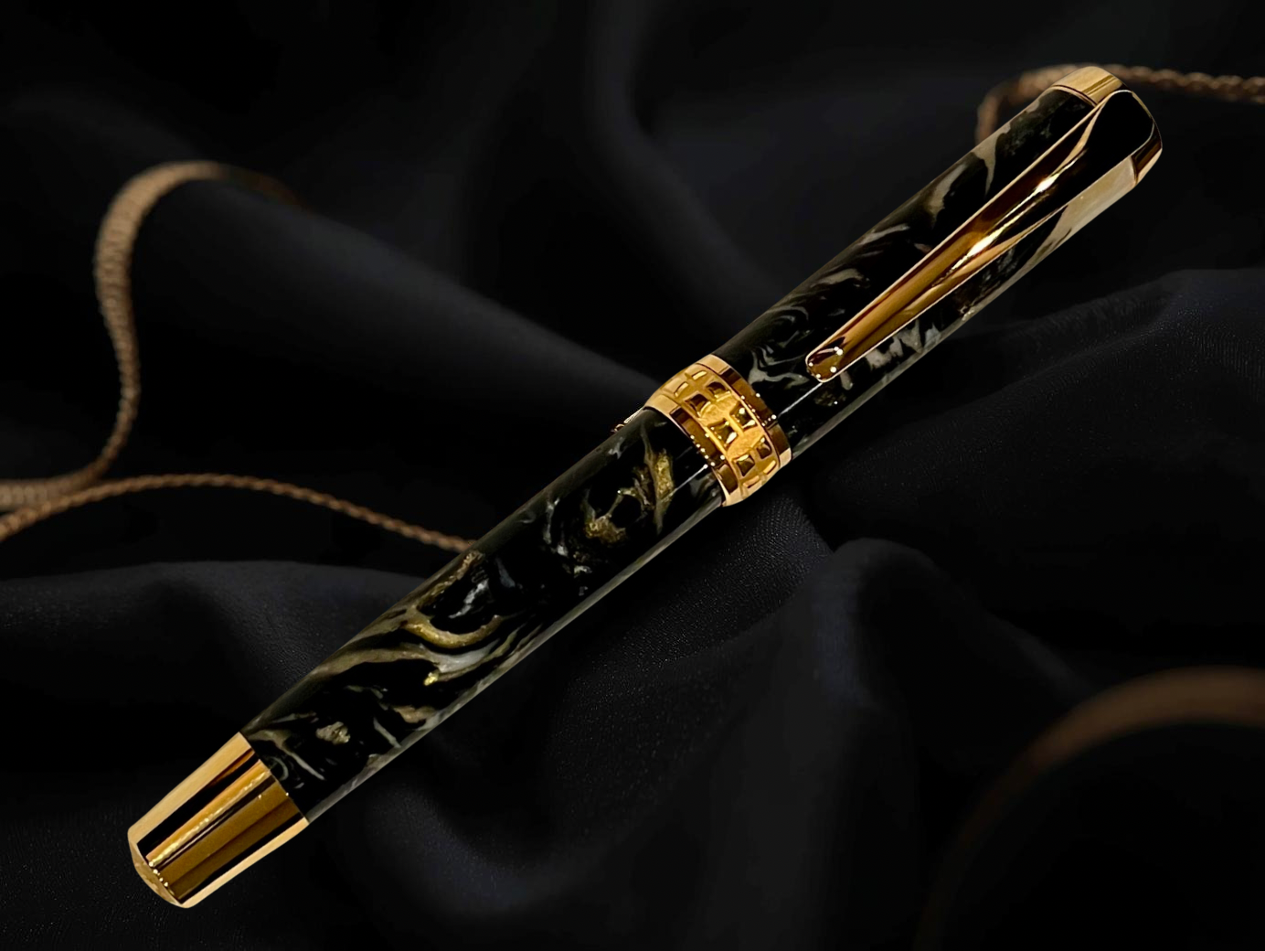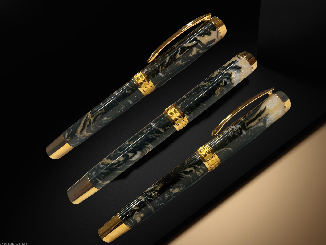 Crafted in a deep black-and-gold marbled resin with full gloss gold hardware, Treasure Hunt feels like uncovering a hidden relic washed in sunlight. The swirling resin recalls weathered treasure maps, ancient sands, and veins of gold running through dark stone. This is a pen for those who chase stories, seek meaning, and appreciate the quiet authority of a truly handcrafted piece.