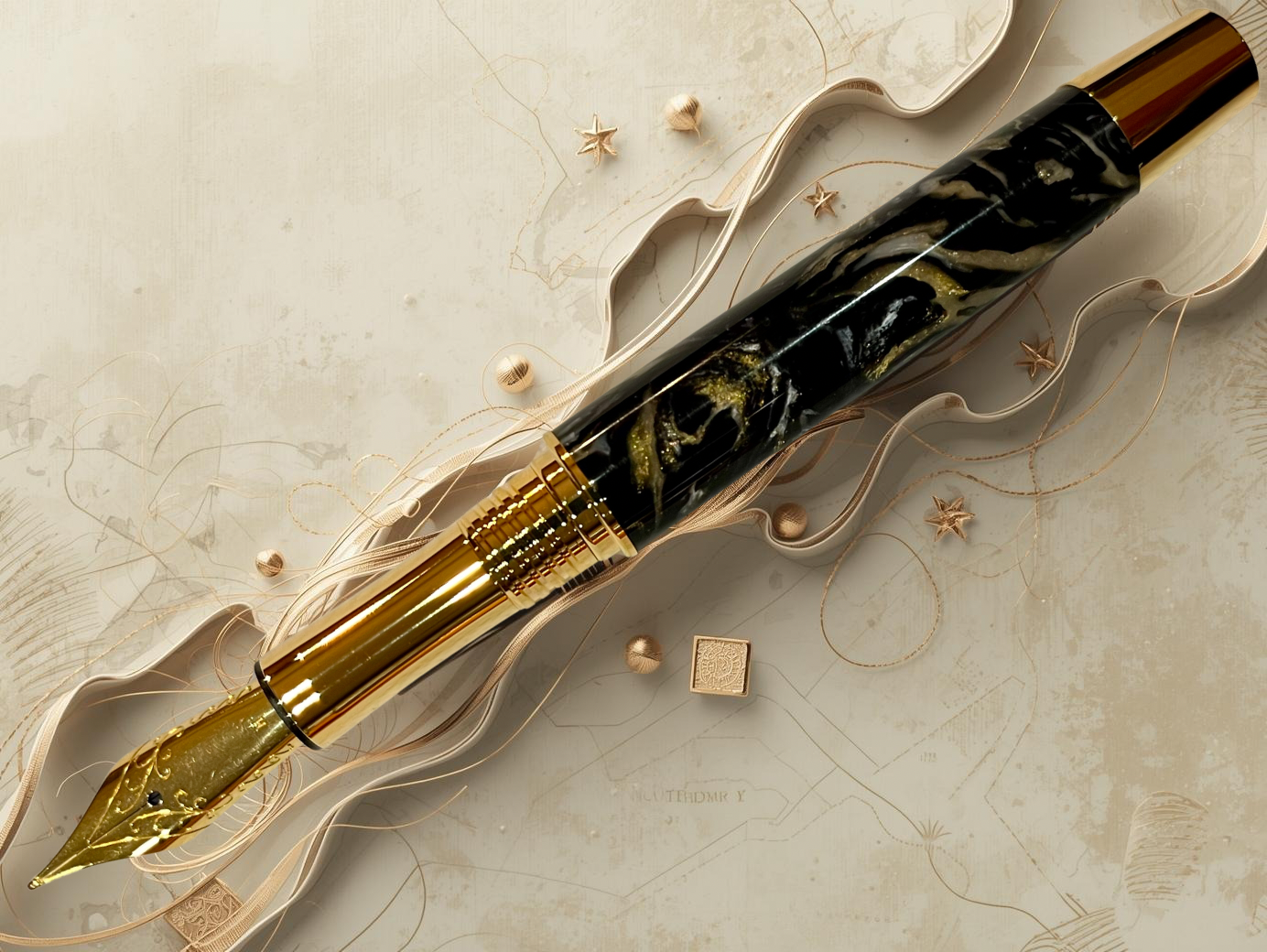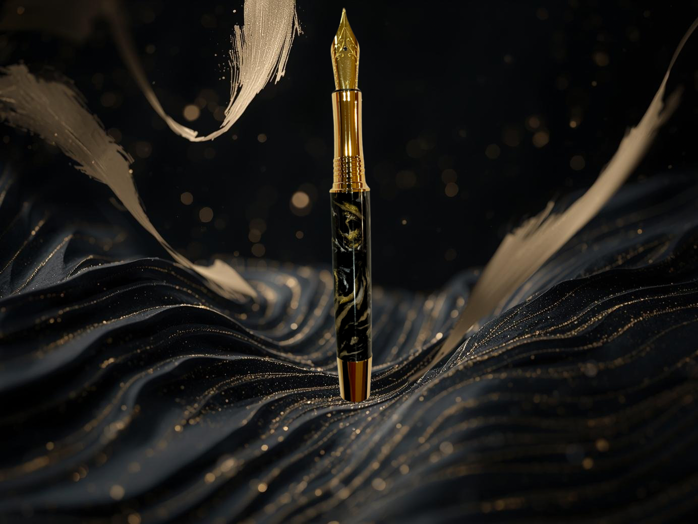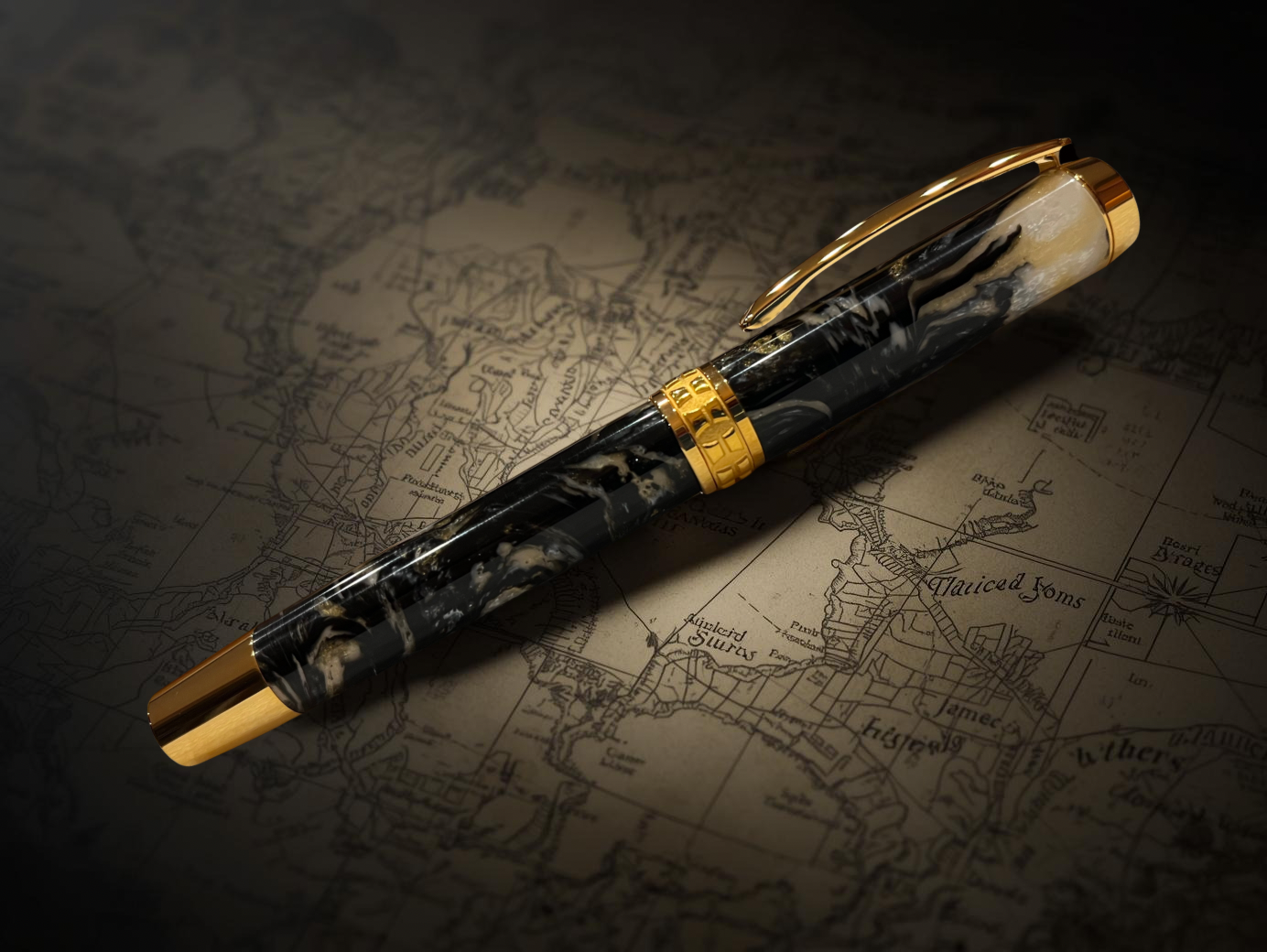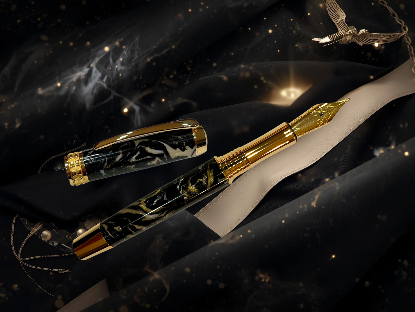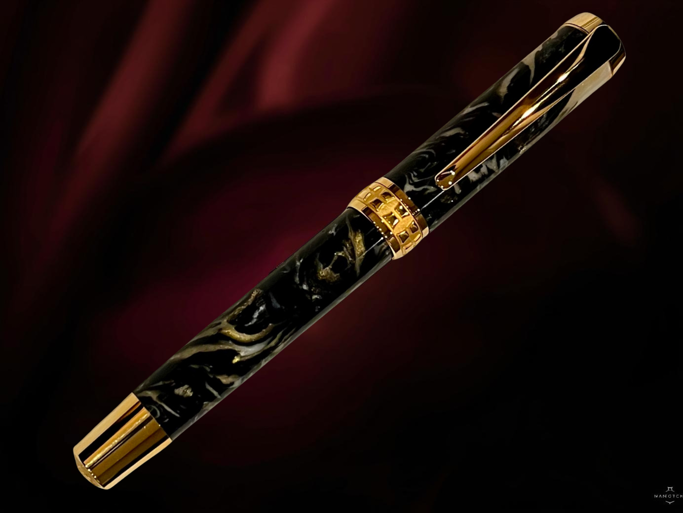 Crafted in a deep black-and-gold marbled resin with full gloss gold hardware, Treasure Hunt feels like uncovering a hidden relic washed in sunlight. The swirling resin recalls weathered treasure maps, ancient sands, and veins of gold running through dark stone. This is a pen for those who chase stories, seek meaning, and appreciate the quiet authority of a truly handcrafted piece.