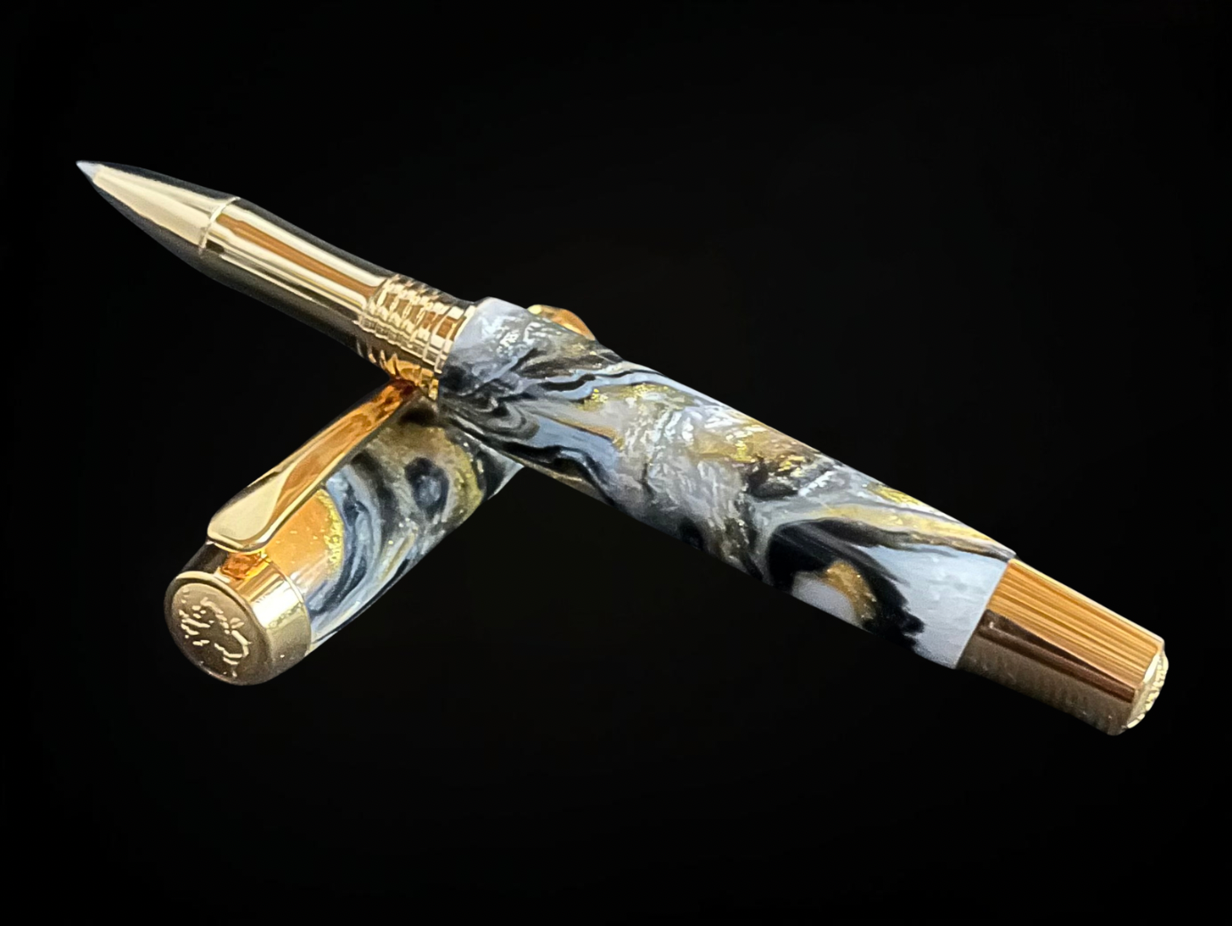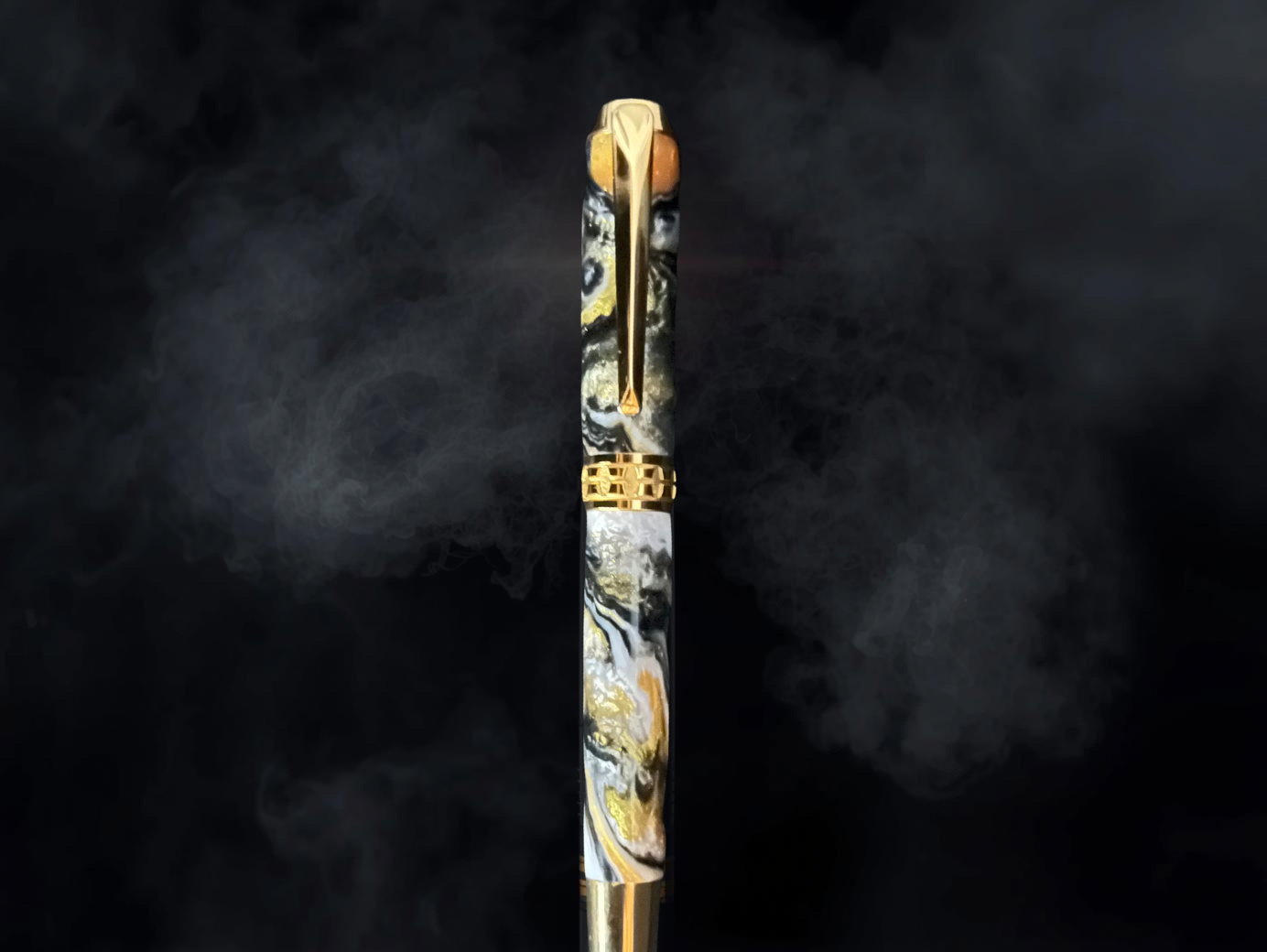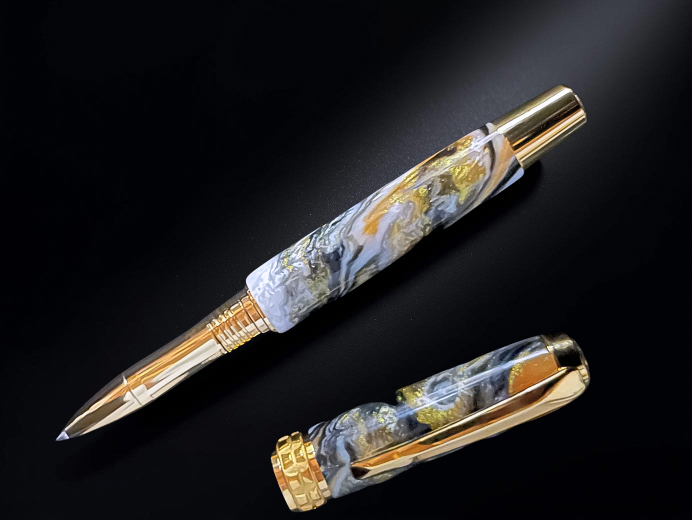 Born from a cosmic palette of gold, black, white, and fire-orange, Solar Eclipse captures the magic of celestial contrast. This one-of-a-kind rollerball pen features radiant gold trim and a molten resin body that dances between darkness and brilliance with every angle. It’s a pen that doesn’t just write—it leaves an impression.