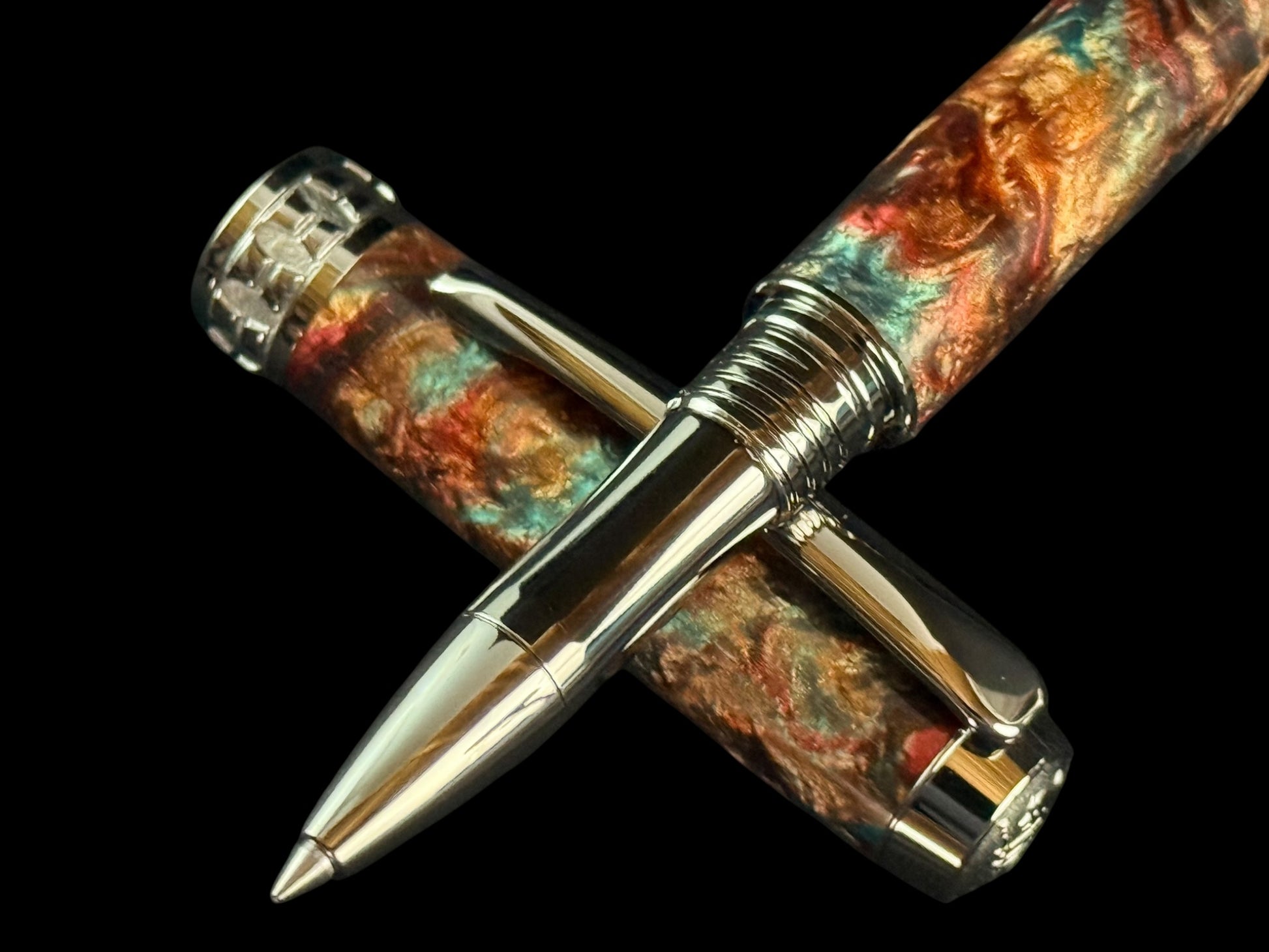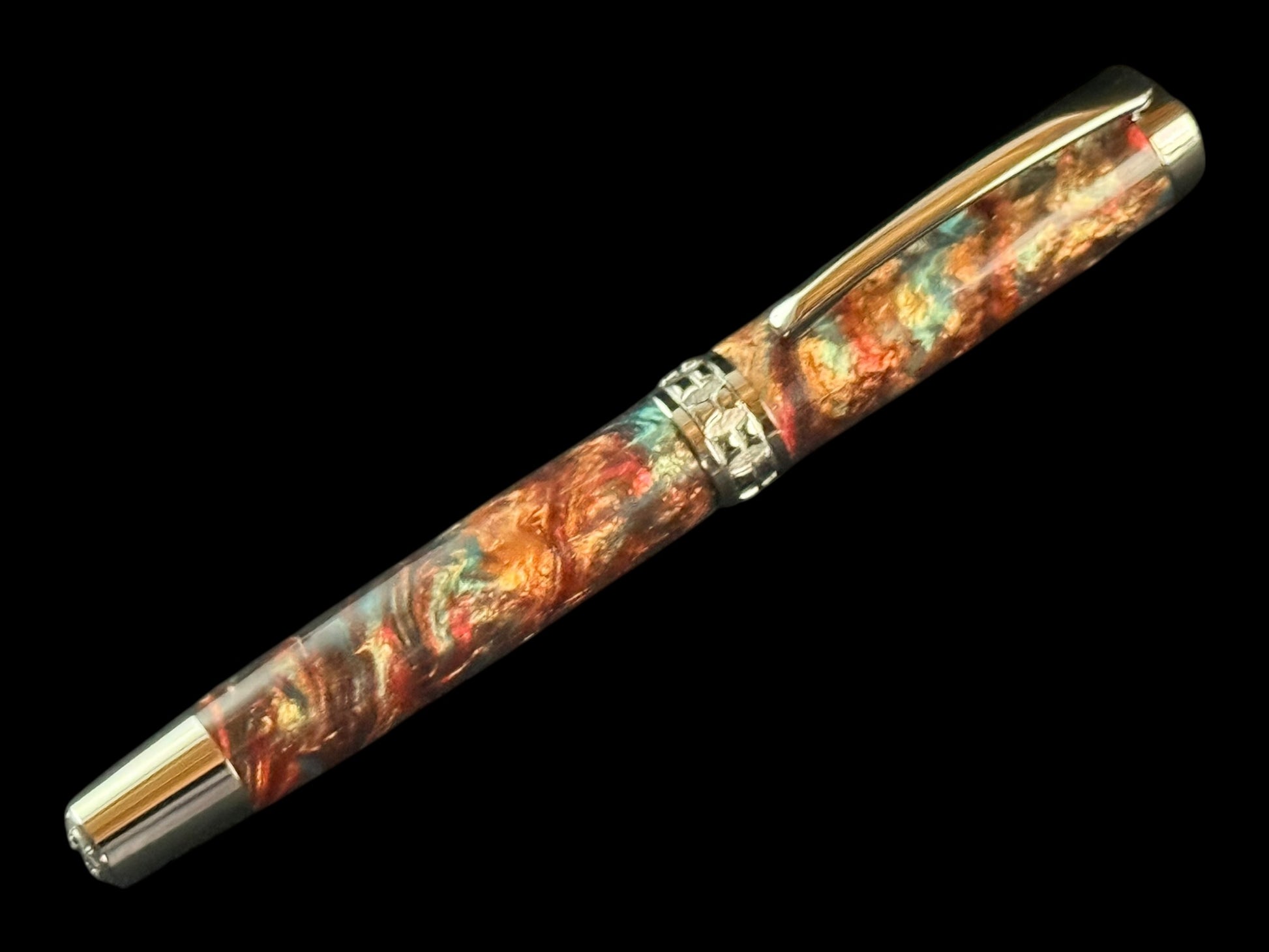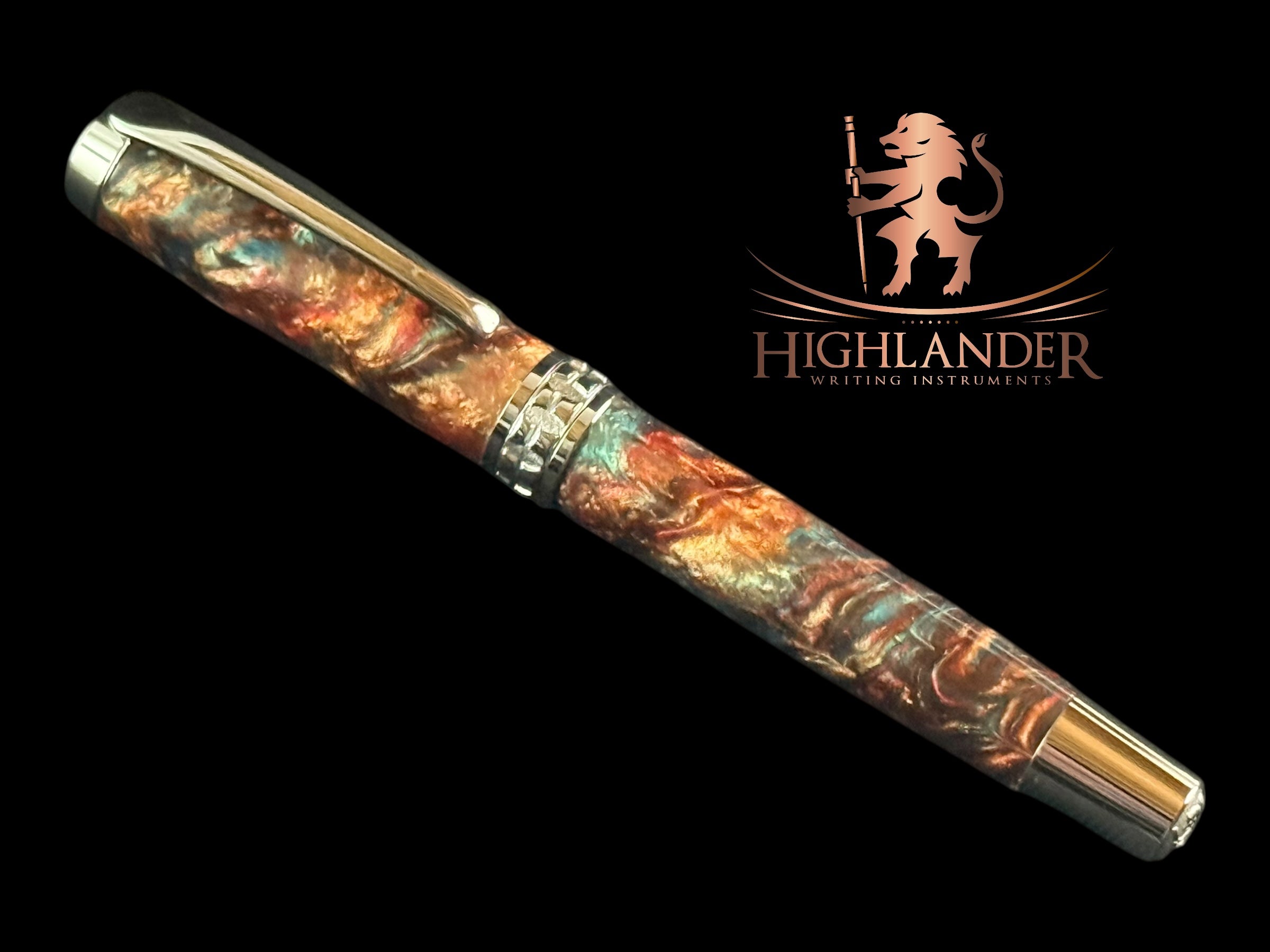 ~Your New “Dragon Skin” Highlander Collection Black Titanium Rollerball Pen. A beautiful combination of swirling wine reds, blue, and copper handmade resins. Each Pen Is One Of A Kind, Hand Lathed In Lone Tree, Colorado, USA.