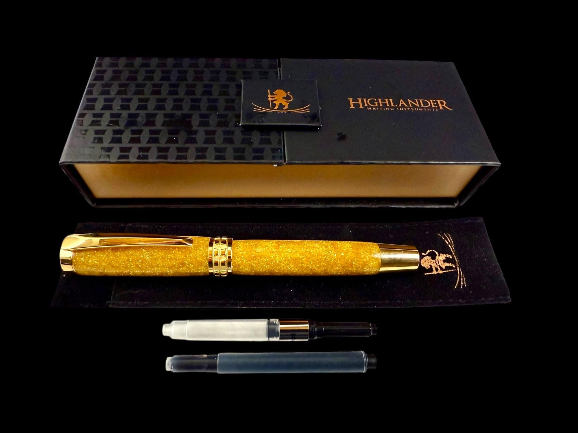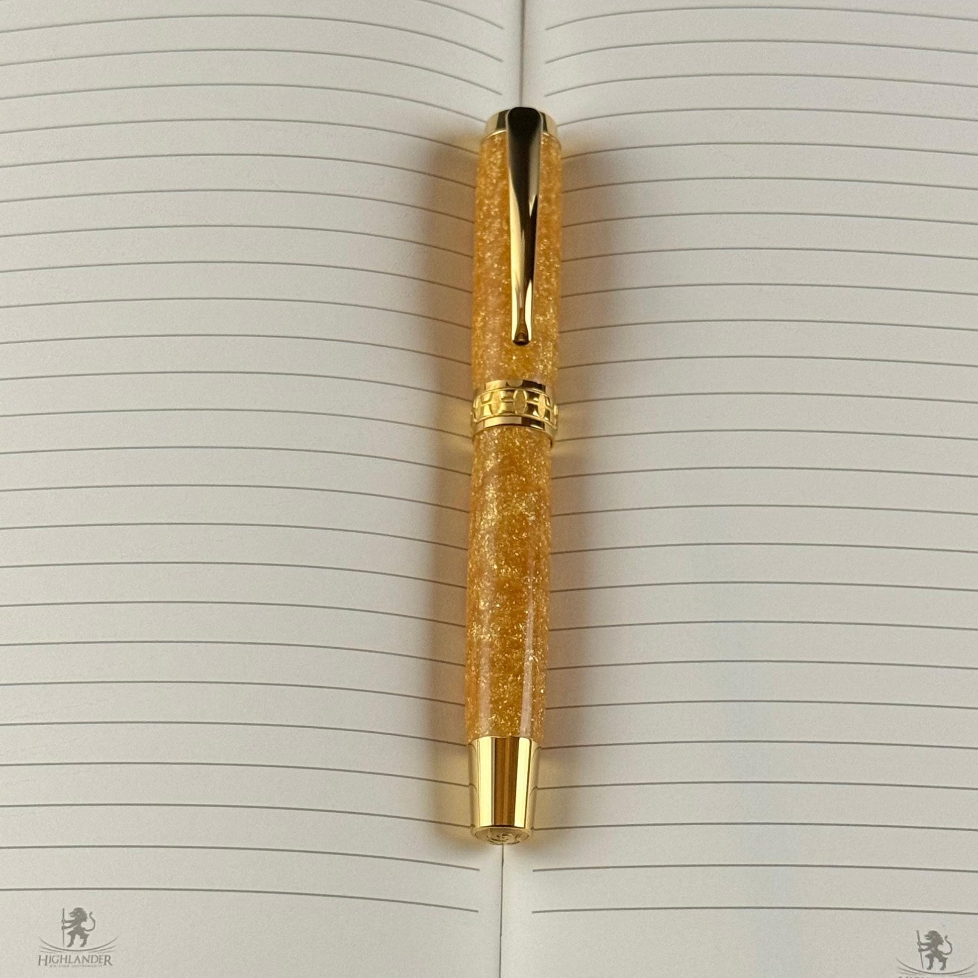 Apollo is forged for those who speak boldly and write with light. Cast in lustrous gold resin and trimmed in gleaming polished gold, this Highlander fountain pen feels divine in the hand—smooth, balanced, and radiant.