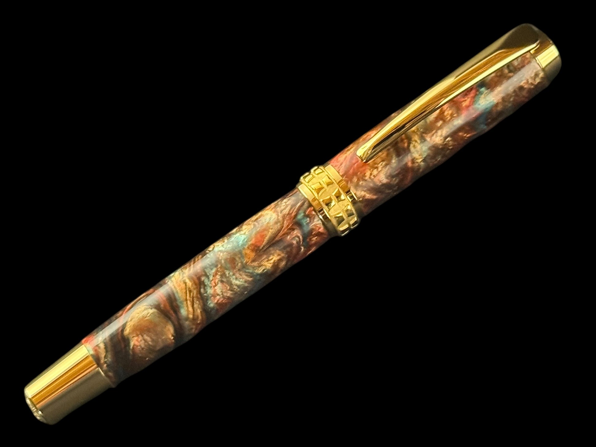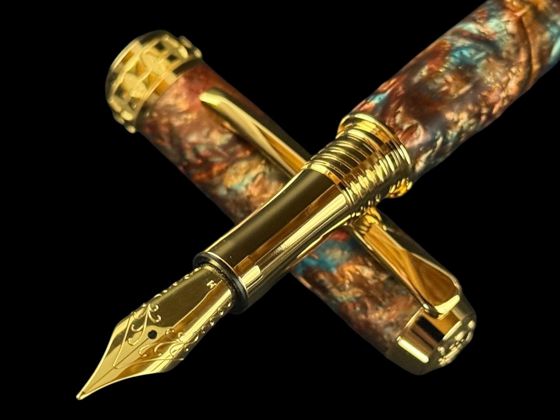 Crafted in Lone Tree, Colorado, the Highlander “Dragon Skin” Gold Fountain Pen rises from fire and fantasy to assert itself as a showpiece for collectors and writing aficionados. Each pen is one-of-a-kind, hand poured and hand-lathed in richly patterned resin, and trimmed in brilliant gold hardware.