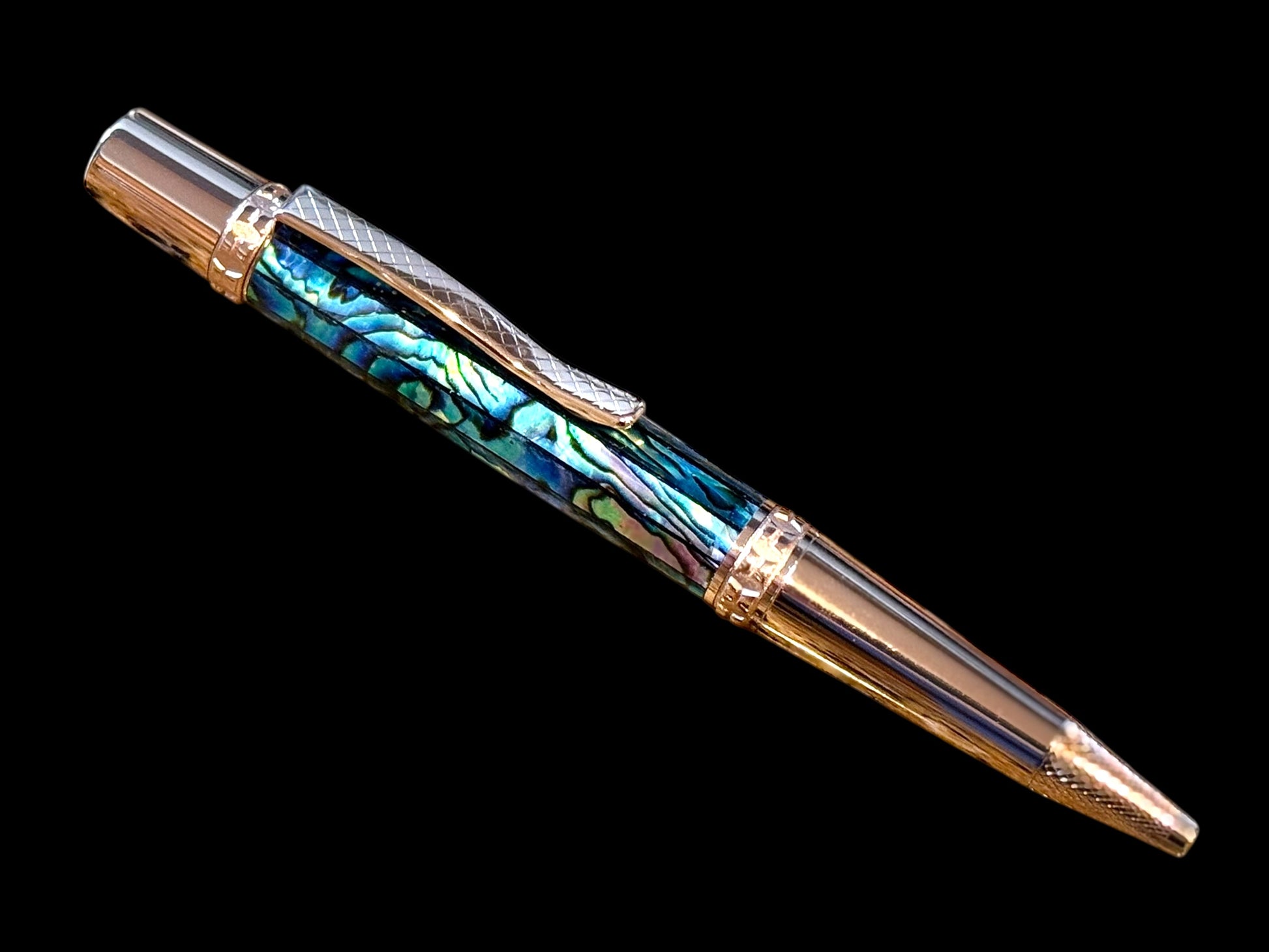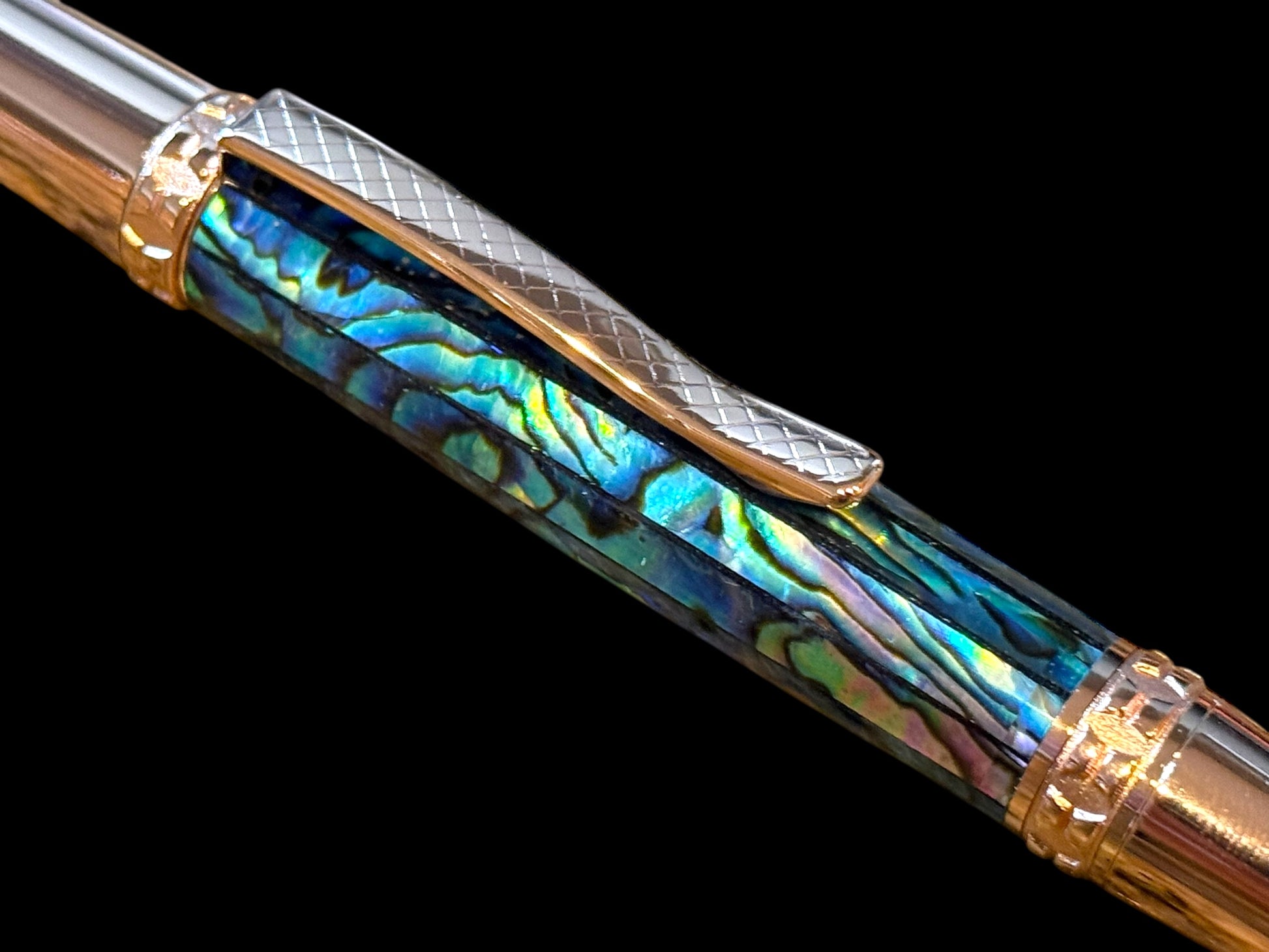 • This Abalone is sourced responsibly from New Zealand. We then painstakingly cut the abalone into strips before attaching to our hardware. The abalone is then covered in a crystal clear finish then turned to perfect shape on our lathe.