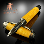 Our Custom Hardware Intricately Engraved With A Rampant Lion, A Revered National Symbol Of Scotland, Is A Testament To Our Craftsmanship And Heritage. This Majestic Creature, Depicted Standing On Writing Paper Holding a Pen, Adorns Both The Cap And Body Finials, Embodying Strength, Courage, And Nobility. Beyond Its Symbolic Significance, The Lion Provides Balanced Weight Distribution, Ensuring Writers Precision In Every Stroke. The Center Band Showcases A Series Of Our Understated Yet Distinguished “H” Logo. A Subtle Nod To Our Identity And A Reminder That We Are All Highlanders At Heart.