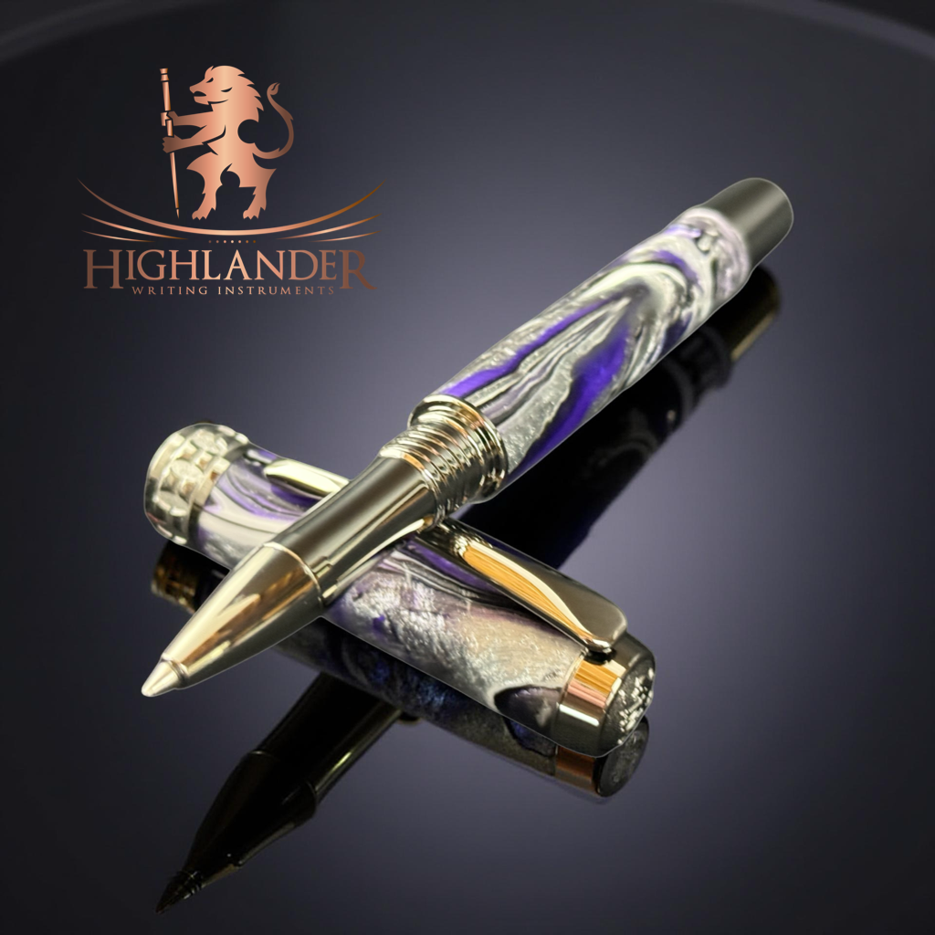 ~Your New “Purple Waterfall” Highlander Collection Black Titanium Rollerball Pen. Each Pen Is One Of A Kind, Hand Lathed In Lone Tree, Colorado, USA.
