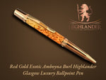 • Your brand new exotic Amboyna Burl Wood handmade Highlander Writing Instruments Red Gold Glasgow ballpoint pen.